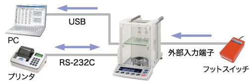 可以同时将“PC 和打印机”、“PC 和数据记录器”、“PC 和外部输出显示器”连接到天平。 包括 AB 型 USB 电缆(约 1.5 米)。