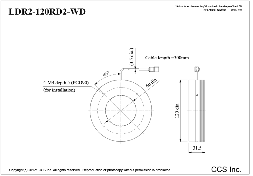 | 外观尺寸 | Outer diameter 120 mm, Inner diameter 60 mm, Height 31.5 mm (*Actual inner diameter is φ56mm due to the shape of the LED. ) |