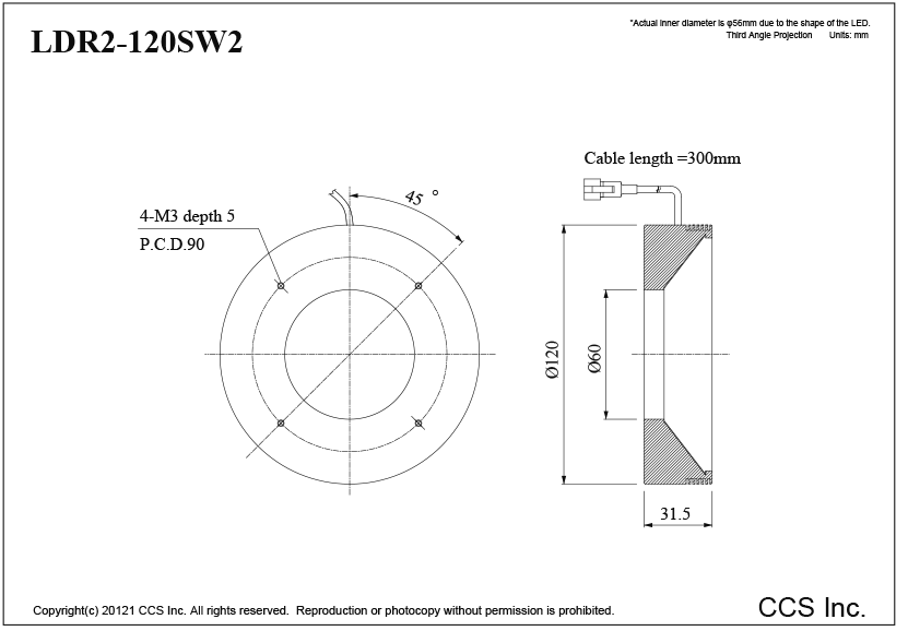 | 外观尺寸 | Outer diameter 120 mm, Inner diameter 60 mm, Height 31.5 mm (*Actual inner diameter is φ56mm due to the shape of the LED. ) |