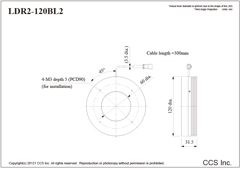 | 外观尺寸 | Outer diameter 120 mm, Inner diameter 60 mm, Height 31.5 mm (*Actual inner diameter is φ56mm due to the shape of the LED. ) |