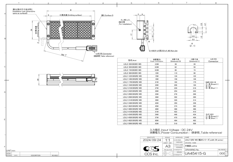 日本CCS西西斯 条形光源 LDL2-170X30GR2-WD日本CCS西西斯 条形光源 LDL2-170X30GR2-WD产品详细信息LED发光颜色Green峰值发光波长520 nm typ.外观尺寸W 182 mm x D 34 mm x H 20 mm输入电压24VDC消耗功率21 W max.极性, 信号1: (+), 2: NC, 3: (-)线缆长度300 mm外…