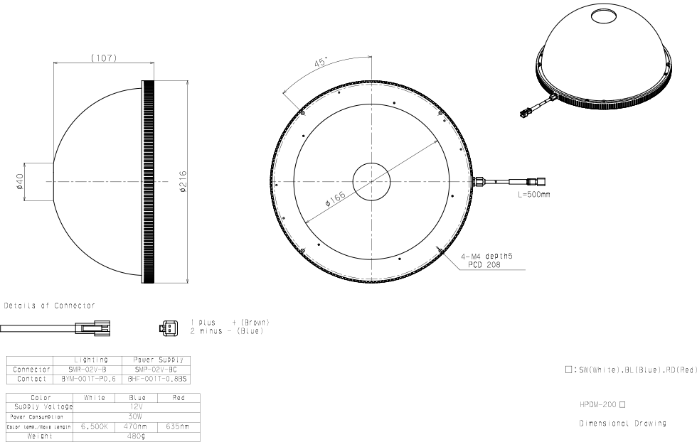 日本CCS西西斯 圆顶光源 HPDM-200RD日本CCS西西斯 圆顶光源 HPDM-200RD产品详细信息LED发光颜色Red峰值发光波长635 nm typ.外观尺寸Outer diameter 216 mm, Inner diameter 166 mm, Height 107 mm输入电压12 VDC消耗功率30 W max.极性, 信号1: ( + ) , 2: ( - …