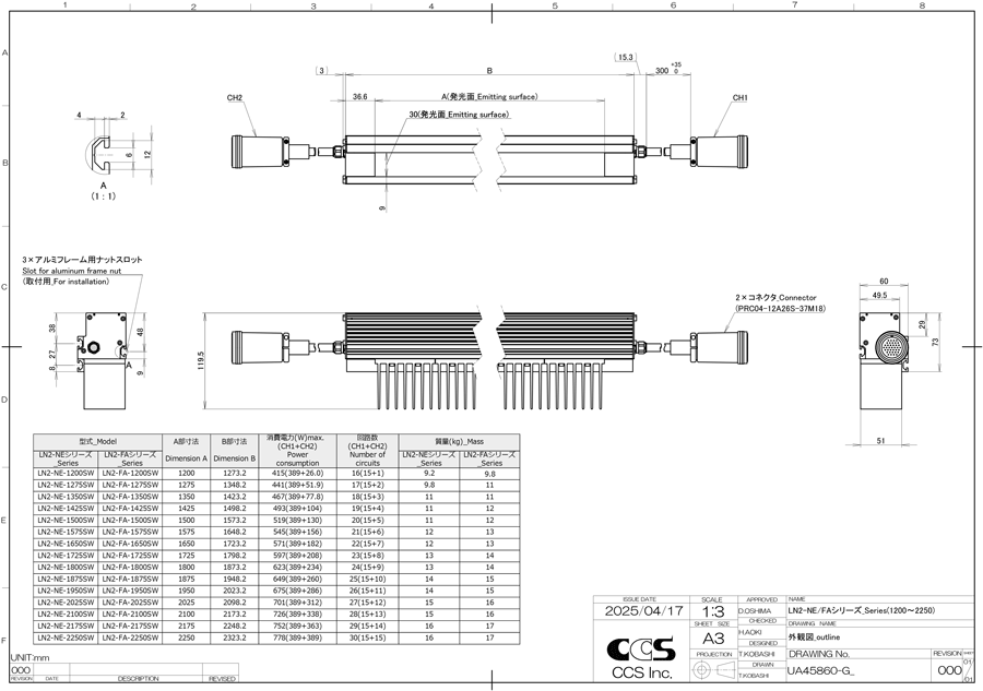 日本CCS西西斯 线光源 LN2-NE-1200SW日本CCS西西斯 线光源 LN2-NE-1200SW产品详细信息LED发光颜色White相关色温6,500 K typ.外观尺寸W 1,273.2 mm x D 60 mm x H 119.5 mm消耗功率415 W max.线缆长度CH1 : 300 mmCH2 : 300 mm外壳材质Aluminum alloy, Steel …