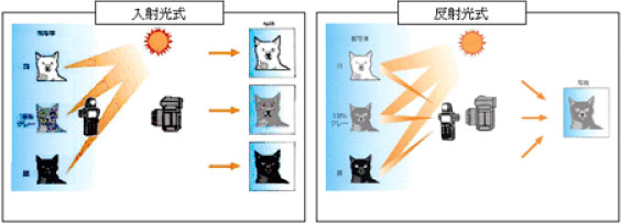 反射光曝光计测量从拍摄对象反射的光,类似于相机内置的曝光计。相机和测光表等仪器无法辨别拍摄对象是白色还是黑色,因此它们指示测量区域将呈灰色(中等浓度)的曝光值。因此,它受到被摄体的反射率(亮度、颜色等)的影响。虽然这样可以检查曝光值是否在胶片或CCD的有效曝光范围内,并检查亮度差异,但它也需要摄影师自己进行曝光补偿。