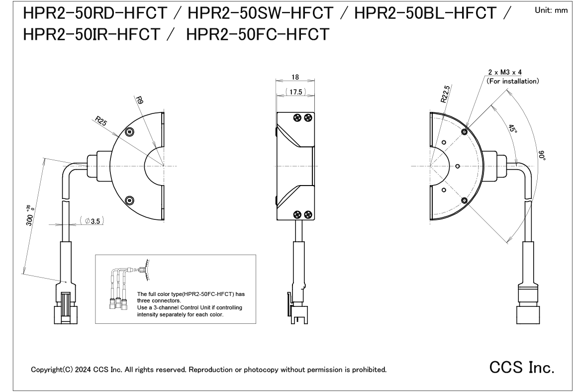 | 注意事项 | The full-color type (HPR2-50FC-HFCT) has three connectors. Use a 3-channel control unit if controlling intensity separately for each color. Cannot be used with the strobe control unit (overdrive mode). |