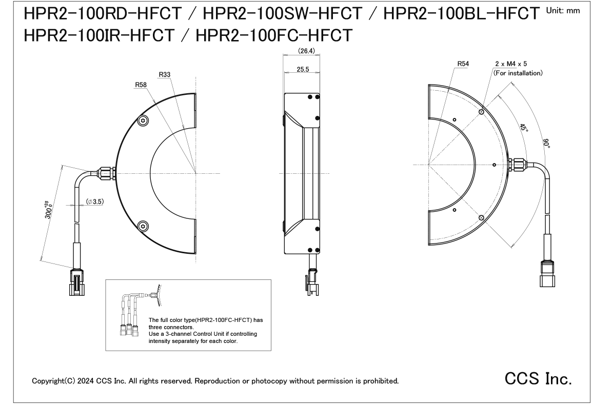 | 注意事项 | The full-color type (HPR2-100FC-HFCT) has three connectors. Use a 3-channel control unit if controlling intensity separately for each color. Cannot be used with the strobe control unit (overdrive mode). |
