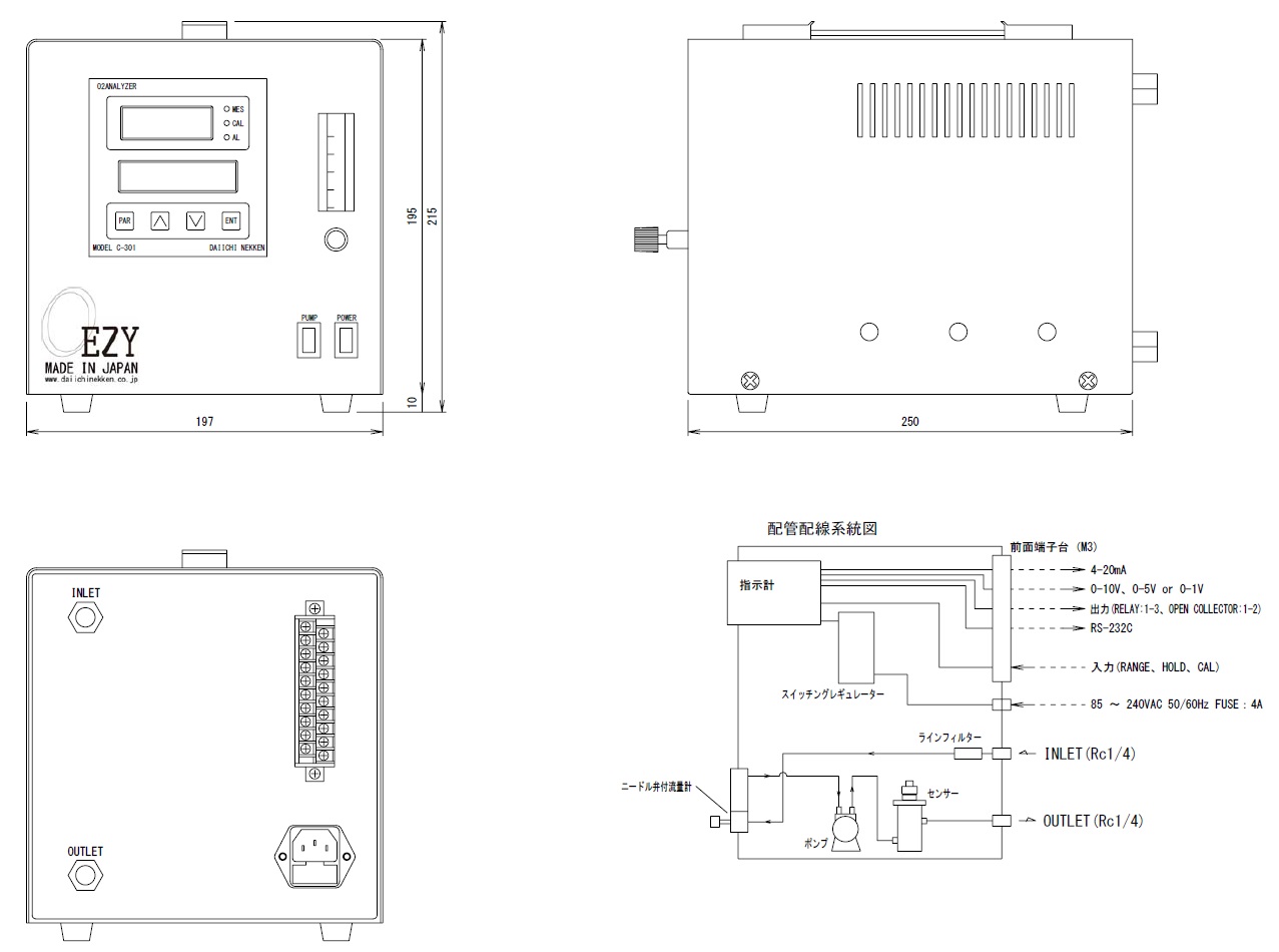 | 漂移线性度、重复性、响应速度。 管道连接 样品流速 样品温度 暖机时间 权力 附属品 | ± 每周2%FS以内/1%FS以内±或±1ppm以内±1%FS以内或±1ppm,以较大者为准,10秒内90%反应(摆动到高浓度侧时) RC1/4 0.2~2L/分钟 最高 60°C 约20分钟 免费电源(85~260VAC) 电源线 3m | |||||