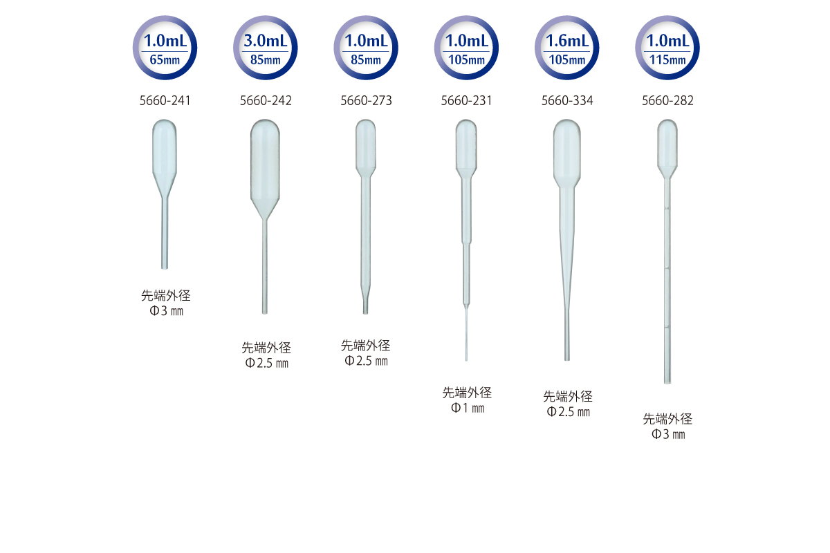 | 5660-242 | 移液管 | 3.0 毫升 | 85 毫米 | 1,000 瓶(250 瓶×4 袋) | 13,100 日元 |