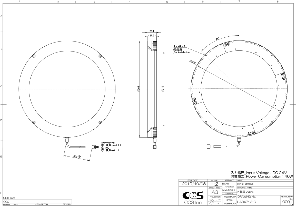 日本CCS西西斯 环型光源 HPR2-250IR86日本CCS西西斯 环型光源 HPR2-250IR86产品详细信息LED发光颜色Infrared峰值发光波长860 nm typ.外观尺寸Outer diameter 266 mm, Inner diameter 210 mm, Height 26.4 mm输入电压24VDC消耗功率46 W max.极性, 信号1: (+), 2: NC…