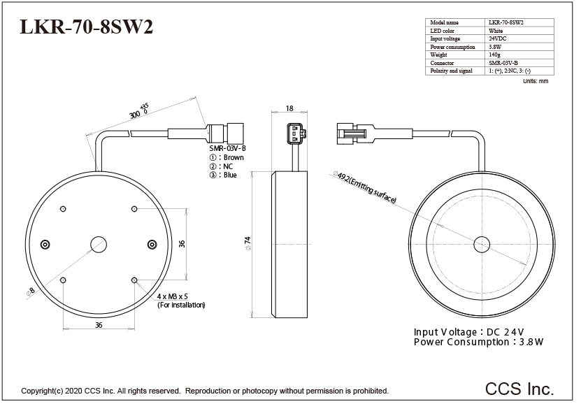 日本CCS西西斯 环型光源 LKR-70-8SW2日本CCS西西斯 环型光源 LKR-70-8SW2产品详细信息LED发光颜色White相关色温5,500 K typ.外观尺寸Outer diameter 74 mm, Inner diameter 8 mm, Height 18 mm输入电压24VDC消耗功率3.8 W max.极性, 信号1: (+), 2: NC, 3: (-)线缆…