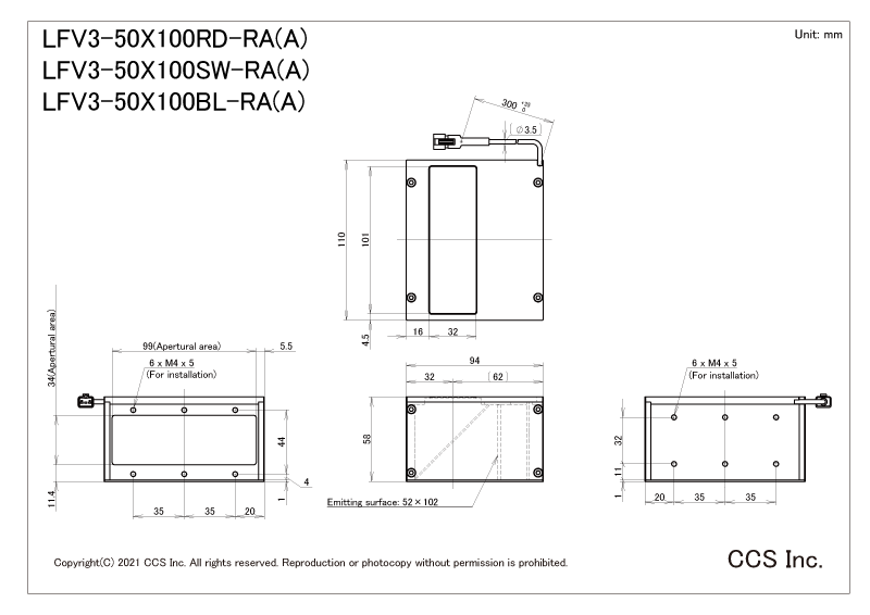 | LED发光颜色 | LFV3-50X100RD-RA(A):Red LFV3-50X100SW-RA(A):White LFV3-50X100BL-RA(A):Blue |