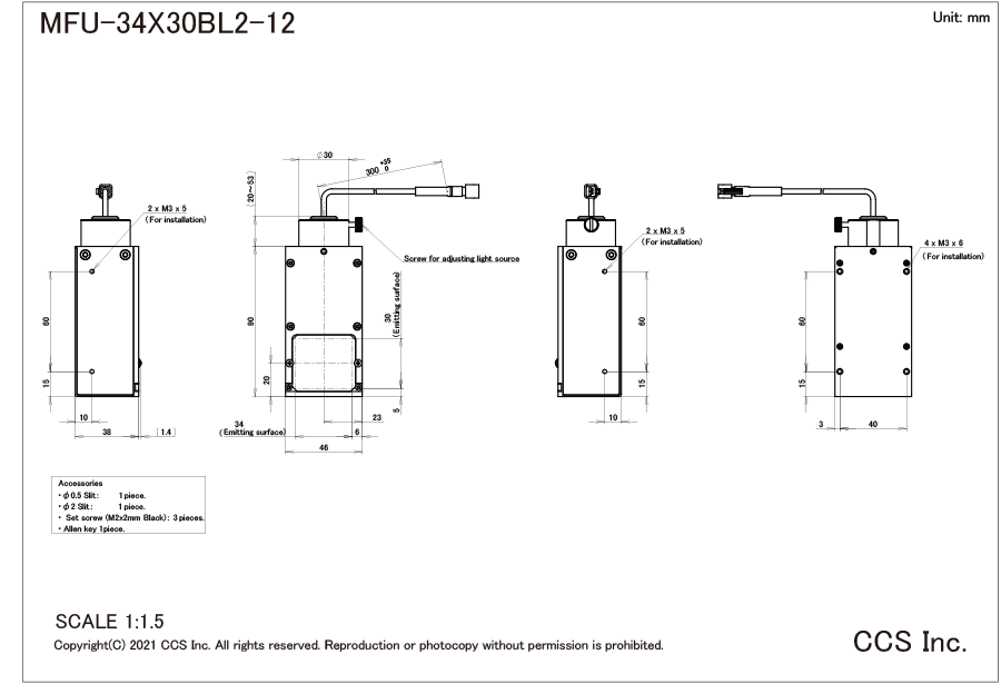 | 附属品 | Aperture (φ0.5 mm) x 1, Aperture (φ1.0 mm) x 1, Aperture (φ2.0 mm) x 1, Set of screws (M2 x 2 mm black) x 3, M2 hexagonal wrench x 1 *An aperture (φ1.0 mm) is attached to the light source part when shipped from the factory. *Replacing with one of the additional apertures supplied (φ0.5 mm and φ2.0 mm) allows the light quantity (high / low) and light distribution (wide / narrow) to be changed. |