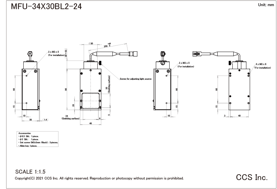 | 附属品 | Aperture (φ0.5 mm) x 1, Aperture (φ1.0 mm) x 1, Aperture (φ2.0 mm) x 1, Set of screws (M2 x 2 mm black) x 3, M2 hexagonal wrench x 1 *An aperture (φ1.0 mm) is attached to the light source part when shipped from the factory. *Replacing with one of the additional apertures supplied (φ0.5 mm and φ2.0 mm) allows the light quantity (high / low) and light distribution (wide / narrow) to be changed. |