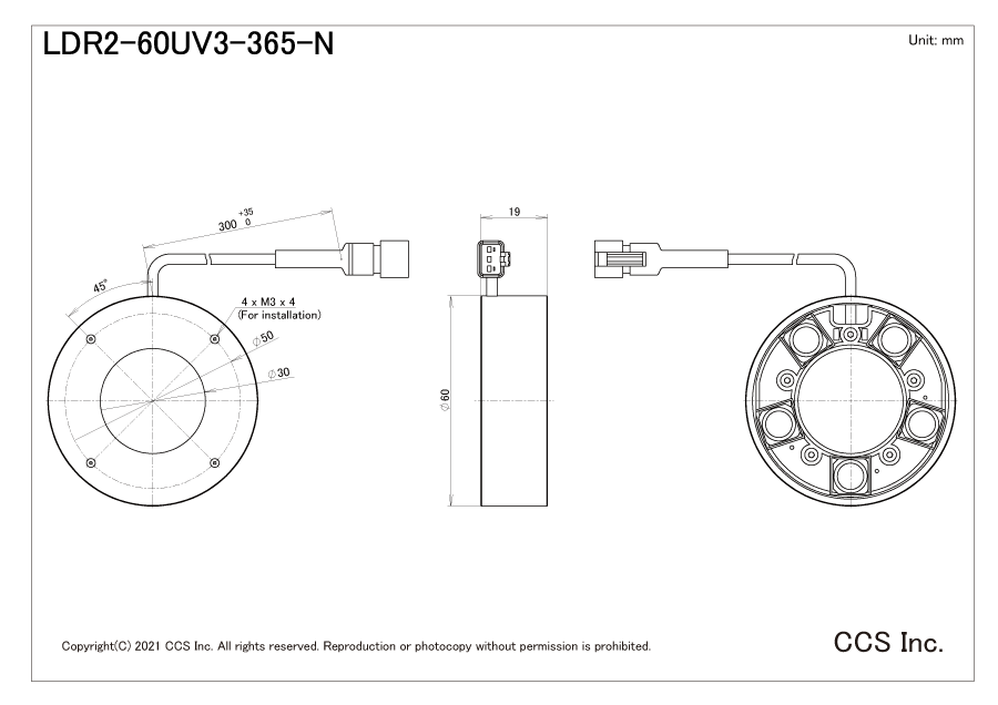 | 重量 | LDR2-60UV3-365-N: 80 g max. LDR2-60UV3-365-W: 85 g max. |