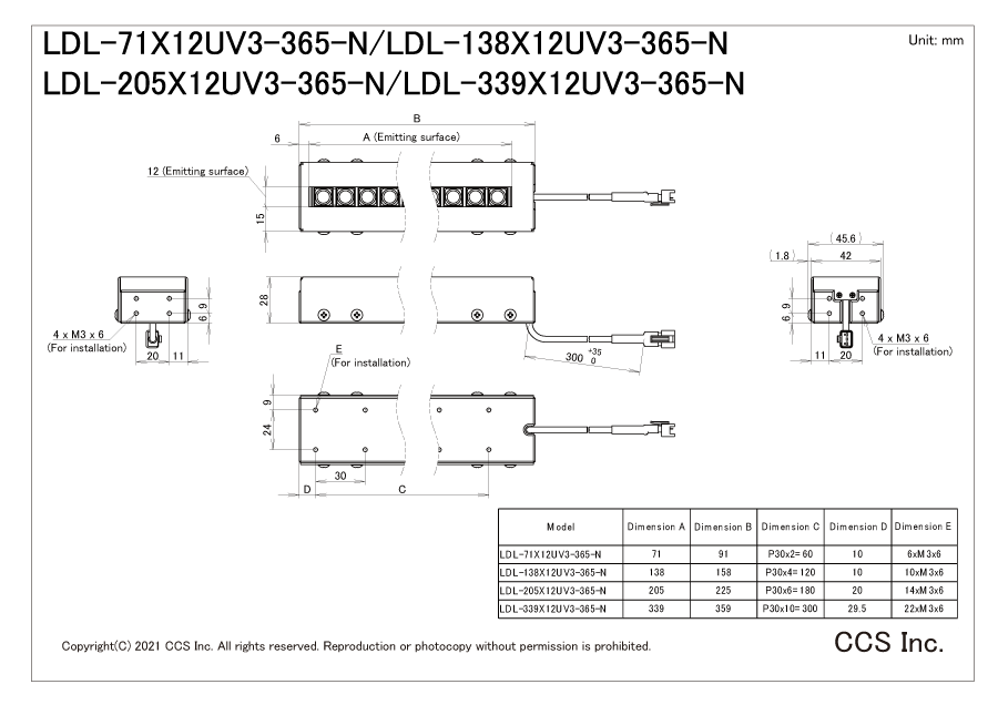 | 适合规格 | CE, UKCA, RoHS IEC 62471 LDL-339X12UV3-365-N: High risk LDL-339X12UV3-365-W: Mod risk |