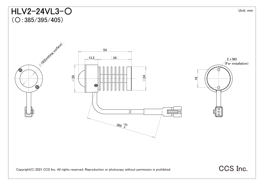 | 适合规格 | CE, UKCA, RoHS IEC 62471 HLV2-24VL3-385: High risk HLV2-24VL3-395: High risk HLV2-24VL3-405: Mod risk |