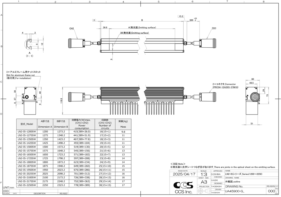 日本CCS西西斯 线光源 LN2-IS-1200SW日本CCS西西斯 线光源 LN2-IS-1200SW产品详细信息LED发光颜色White相关色温6,500 K typ.外观尺寸W 1,273.2 mm x D 60 mm x H 119.5 mm消耗功率415 W max.线缆长度CH1 : 300 mmCH2 : 300 mm外壳材质Aluminum alloy, Steel shee…