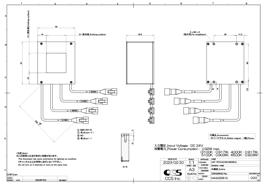 | 使用温湿度 | Temperature: 0 to 40°C, Humidity: 20 to 85%RH (with no condensation) To reduce the color temperature fluctuation, it is recommended to use in an ambient temperature range of 20 to 30 °C. |